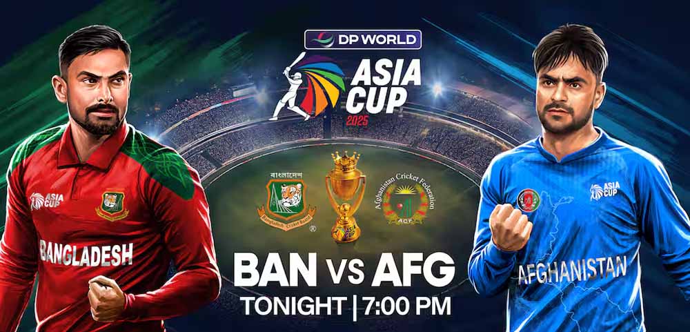 आज अफगानिस्तान और बांग्लादेश के बीज एशिया कप 2025 का नौवां मैच खेला जा रहा है। दोनों टीमों की अबु धाबी के शेख जायद स्टेडियम में टक्कर हो रही है। बांग्लादेश ने 'करो या मरो' मैच में टॉस जीतकर बैटिंग चुनी है। बांग्लादेश ने अपनी प्लेइंग इलेवन में चार बदलाव किए हैं जबकि अफगानिस्तान ने कोई फेरबदल नहीं किया। ग्रुप बी का हिस्सा राशिद खान की अगुवाई वाली अफगानिस्तान टीम टूर्नामेंट में दूसरी बार मैदान पर उतरी है और सुपर-4 का टिकट कटाने पर नजर है। उसने पहले मैच में हॉन्ग कॉन्ग को 94 रनों से रौंदा था।