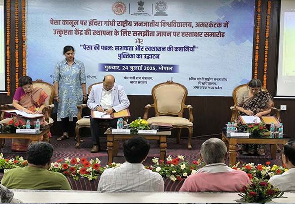 भोपाल स्थित वाल्मी परिसर में गुरूवार को पंचायती राज मंत्रालय भारत सरकार, मध्यप्रदेश शासन तथा इंदिरा गांधी राष्ट्रीय जनजातीय विश्वविद्यालय (आईजीएनटीयू), अमरकंटक के संयुक्त तत्वावधान में हुए कार्यम्रम में पेसा कंपेडियम का विमोचन तथा एमओयू समझौता ज्ञापन पर हस्ताक्षर किए गए।