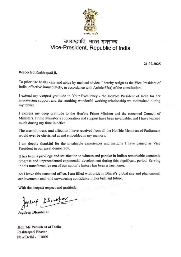माननीय राष्ट्रपति जी .. सेहत को प्राथमिकता देने और डॉक्टर की सलाह को मानने के लिए मैं संविधान के अनुच्छेद 67(a) के अनुसार अपने पद से इस्तीफा देता हूं। मैं भारत के राष्ट्रपति में गहरी कृतज्ञता प्रकट करता हूं। आपका समर्थन अडिग रहा, जिनके साथ मेरा कार्यकाल शांतिपूर्ण और बेहतरीन रहा। मैं माननीय प्रधानमंत्री और मंत्रिपरिषद के प्रति भी गहरी कृतज्ञता व्यक्त करता हूं। प्रधानमंत्री का सहयोग और समर्थन अमूल्य रहा है और मैंने अपने कार्यकाल के दौरान उनसे बहुत कुछ सीखा है। माननीय सांसदों से मुझे जो स्नेह, विश्वास और अपनापन मिला है, वह मेरी स्मृति में हमेशा रहेगा। मैं इस बात के लिए आभारी हूं कि मुझे इस महान लोकतंत्र में उपराष्ट्रपति के रूप में जो अनुभव और ज्ञान मिला, वह अत्यंत मूल्यवान रहा। यह मेरे लिए सौभाग्य और संतोष की बात रही है कि मैंने भारत की अभूतपूर्व आर्थिक प्रगति और इस परिवर्तनकारी युग में उसके तेज विकास को देखा और उसमें भागीदारी की। हमारे राष्ट्र के इतिहास के इस महत्वपूर्ण दौर में सेवा करना मेरे लिए सच्चे सम्मान की बात रही। आज जब मैं इस सम्माननीय पद को छोड़ रहा हूं, मेरे दिल में भारत की उपलब्धियों और शानदार भविष्य के लिए गर्व और अटूट विश्वास है। गहरी श्रद्धा और आभार के साथ, जगदीप धनखड़
