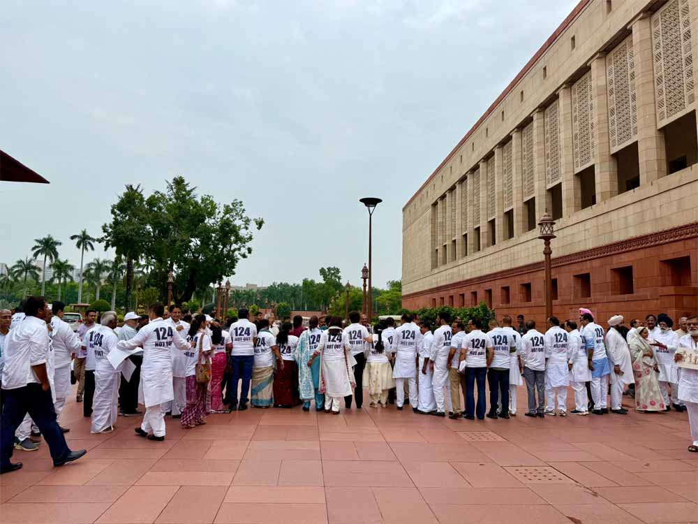 बिहार में जारी चुनाव आयोग के वोटर लिस्ट रिवीजन (SIR) के खिलाफ संसद में विपक्षी सांसदों ने मंगलवार को भी प्रदर्शन किया। इस दौरान प्रियंका गांधी वाड्रा समेत कई कांग्रेस सांसद एक महिला का फोटो और नाम वाला टीशर्ट पहनकर पहुंचे और एसआईआर का विरोध किया। सभी के टीशर्ट के पीछे की तरफ ‘124 नॉट आउट’ लिखा हुआ था। इसके बाद यह टीशर्ट देश भर के लोगों में चर्चा का विषय बना हुआ है।