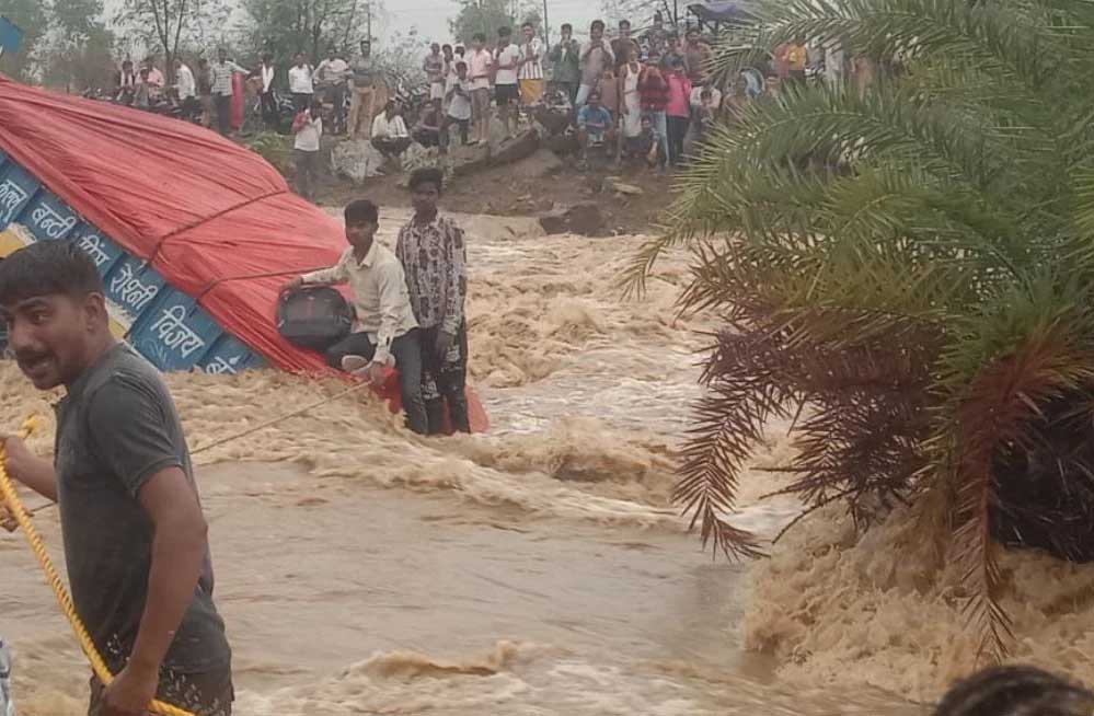 शिवपुरी के सिरसौद थाना क्षेत्र के कुंअरपुर गांव में बारिश का कहर देखने मिला. पहली बारिश में यहां खेरिया नदी ऊपर से बहने लगी है. वहीं लोग जान जोखिम में डालकर पुल को पार कर रहे हैं. इसी तरह शुक्रवार सुबह ट्रैक्टर सवार चार युवक पुल पार कर रहे थे. जहां तेज बहाव में ट्रैक्टर-ट्राली पटल गई और युवक बहने लगे. मौके पर मौजूद ग्रामीणों ने बड़ी मुश्किल से चारों युवकों को रस्सी की मदद से किसी तरह रेस्क्यू करके उनकी जान बचाई.
