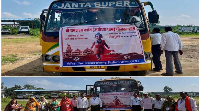 एमसीबी/मनेंद्रगढ़ छत्तीसगढ़ शासन की महत्वाकांक्षी श्री रामलला दर्शन योजना के तीसरे चरण में एमसीबी जिले से चयनित 57 श्रद्धालुओं में से 50 श्रद्धालुओं का दल आज सुबह कलेक्टोरेट परिसर, मनेंद्रगढ़ से अयोध्या धाम के लिए रवाना हुआ। श्रद्धालुओं को अंबिकापुर रेलवे स्टेशन से विशेष ट्रेन द्वारा अयोध्या ले जाया जाएगा, जहां वे श्री रामलला के दिव्य दर्शन करेंगे। इस अवसर पर मुख्यमंत्री श्री विष्णुदेव साय ने सभी राम भक्तों को अपनी हार्दिक शुभकामनाएं और बधाई देते हुए कहा कि राज्य शासन द्वारा प्रदेश के श्रद्धालुओं को निःशुल्क अयोध्या धाम ले