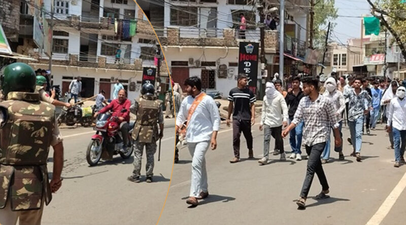 गुना में हनुमान जन्मोत्सव के दिन शोभायात्रा पर हुए हमले के विरोध में विश्व हिंदू परिषद और बजरंग दल ने शहर में प्रदर्शन किया