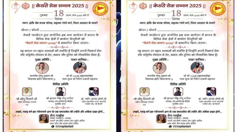 इंदौर समाज सेवा और राष्ट्र सेवा के विभिन्न क्षेत्रों में उल्लेखनीय योगदान देने वाली 21 प्रतिभाशाली हस्तियों को “केसरी सेवा सम्मान 2025” से अलंकृत किया जाएगा। यह भव्य समारोह 18 सितंबर 2025, शाम 4 बजे इंदौर प्रेस क्लब परिसर में आयोजित होगा। इस जानकारी को साझा करते हुए केसरी फाउंडेशन की अध्यक्षा श्रीमती रोमा मल्होत्रा ने बताया कि संस्था विगत एक वर्ष से समाज के विभिन्न आयामों पर कार्य कर रही है। विशेषकर महिलाओं, बच्चों, बुजुर्गों और दिव्यांगजनों के उत्थान हेतु संस्था ने अनेक सामाजिक दायित्व निभाए हैं। इसी कड़ी
