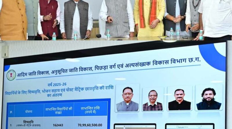 एसटी, एससी, ओबीसी, अल्पसंख्यक तथा आर्थिक रूप से कमजोर वर्ग के विद्यार्थियों के लिए नई सुविधा तकनीकी एवं प्रोफेशनल पाठ्यक्रम में पढ़ाई करने वाले विद्यार्थियों को भी अब ऑनलाईन मिलेगी छात्रवृत्ति नयी व्यवस्था में माह जून, सितंबर, अक्टूबर एवं दिसंबर में अंतरित की जाएगी राशि Read moreएंटी नक्सल आपरेशन में एक और बड़ी सफलता पांच लाख का इनामी नक्सली शंकर मारा गया, मृत नक्सली का शव और पिस्टल बरामदरायपुर, मुख्यमंत्री विष्णु देव साय की पहल पर राज्य के शैक्षणिक संस्थानों, आश्रम-छात्रावासों और तकनीकी एवं प्रोफेशनल पाठ्यक्रम में पढ़ाई करने वाले