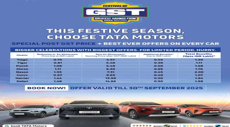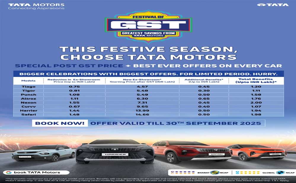 मुंबई   गुड्स एंड सर्विस टैक्स (GST) रिफॉर्म की चर्चा चारो ओर रही है. डेली लाइफ में इस्तेमाल होने वाली कई चीजों की कीमत में भारी कटौती देखने को मिल रही है. लेकिन इस वक्त सबसे ज़्यादा चर्चा जिस ऑफर की हो रही है, वह टाटा मोटर्स का ‘फेस्टिवल ऑफ GST’ कैंपेन. GST 2.0 लागू होने के बाद कंपनी ने जिस आक्रामक अंदाज़ में दाम घटाए हैं और ऊपर से त्योहारों का तड़का लगाया है, वह ग्राहकों के लिए ऐतिहासिक साबित हो सकता है.  कुल 2 लाख तक के फायदे, लॉन्च