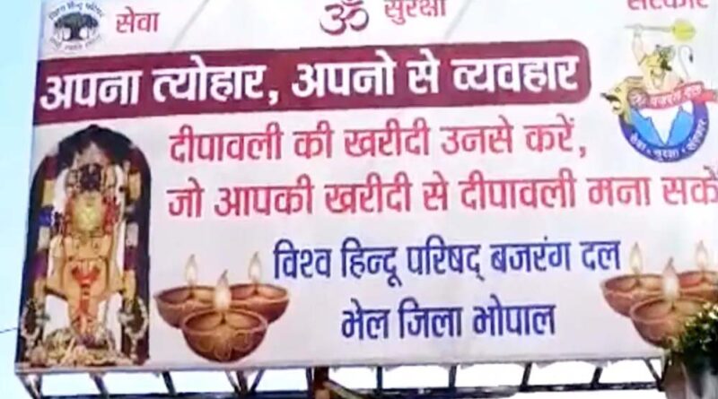 भोपाल देश में त्योहार अब उत्सव से ज्यादा कथित ‘जिहाद’ से निपटने की जंग बनते जा रहे हैं. नवरात्रों में ‘गरबा जिहाद’ के नारे लगे, करवाचौथ पर मेहंदी हिंदुओं से ही लगाने की अपील हुई, तो अब दीपावली से पहले विश्व हिंदू परिषद के होर्डिंग्स ने नया विवाद खड़ा कर दिया है. विश्व हिंदू परिषद (VHP) ने भोपाल में बड़े-बड़े होर्डिंग लगाए हैं, जिन पर मुख्य रूप से यह नारा लिखा है- ‘अपना त्योहार, अपनों से व्यवहार’, और ‘दीपावली की खरीदी उनसे करें, जो आपकी खरीदी से दीपावली मना सकें.’