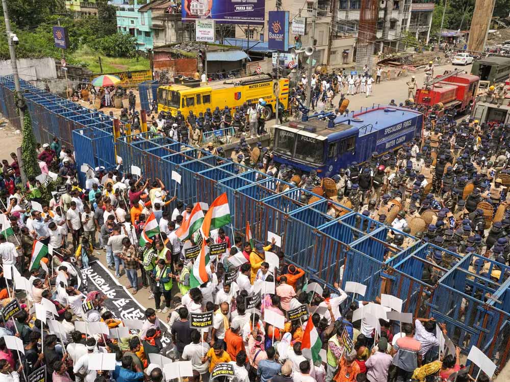 आरजी कर घटना की बरसी पर पश्चिम बंगाल सचिवालय की ओर मार्च करते हुए प्रदर्शनकारियों ने हावड़ा में पुलिस अवरोधक तोड़ने की कोशिश की। सचिवालय की ओर मार्च के दौरान घेरे को तोड़ने की कोशिश कर रहे प्रदर्शनकारियों पर पुलिस ने लाठीचार्ज किया। वहीं, पुलिस द्वारा रोके जाने पर भाजपा नेता शुभेंदु अधिकारी, अग्निमित्रा पॉल धरने पर बैठे गए।